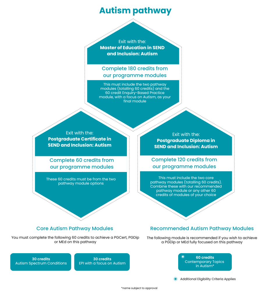 To complete the full MEd, the Enquiry-Based Practice (60 credits) needs to be your final module and your chosen research project for this module must have an autism focus.