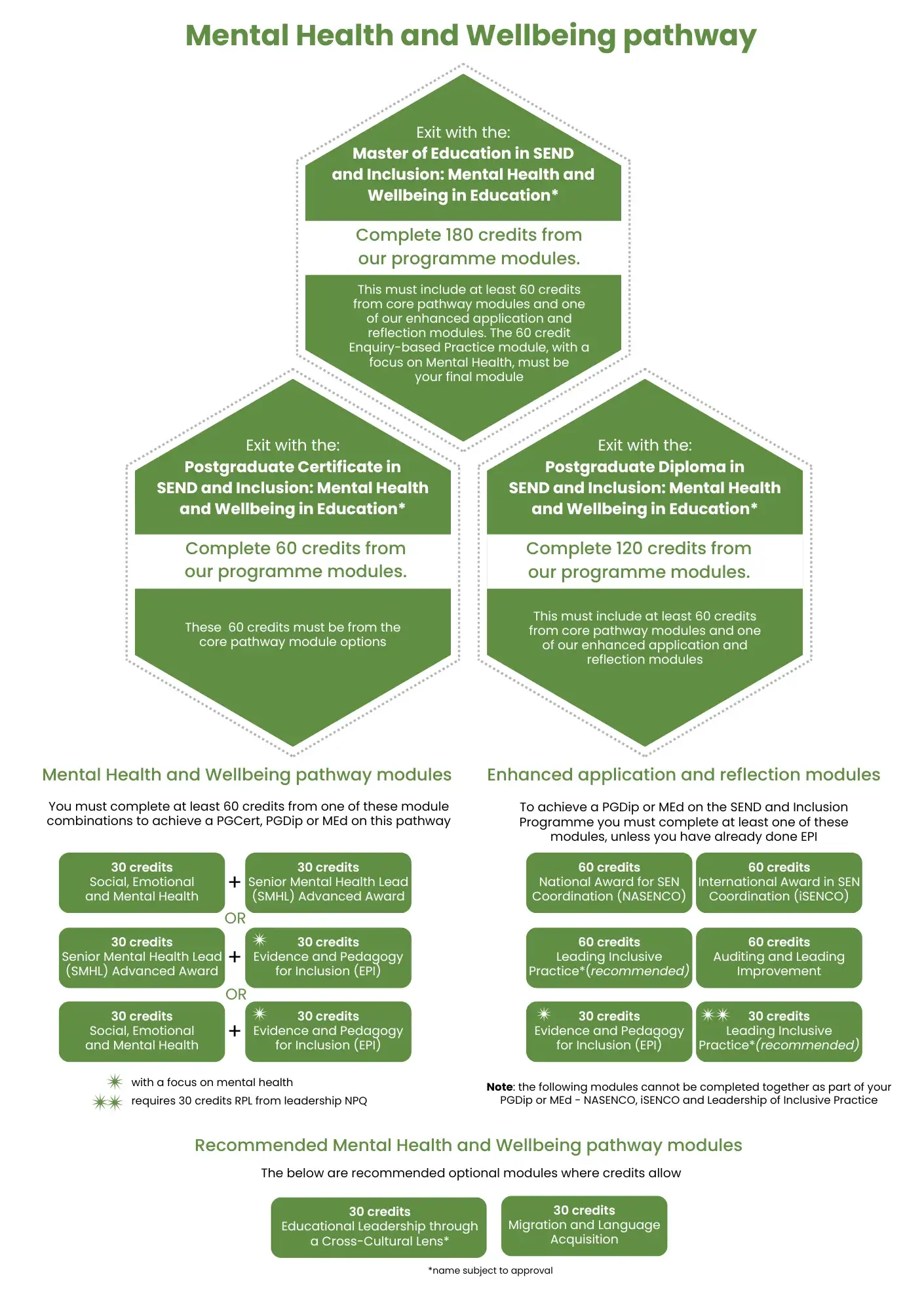• To achieve the Master of Education in SEND and Inclusion: Mental Health and Wellbeing in Education, you’ll need to gain 180 credits
